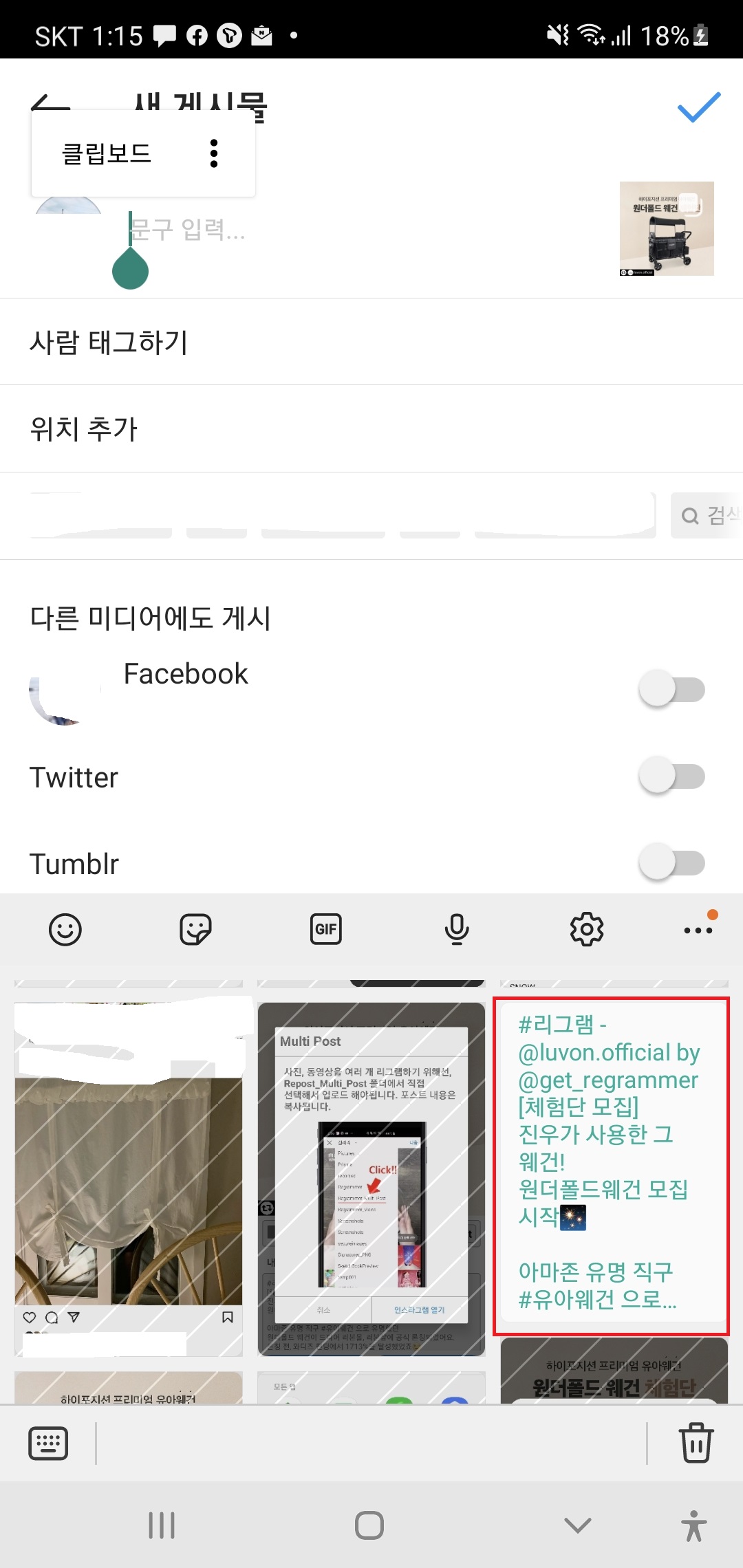 사진선택해주시고 문구입력에서는 클립보드를 누르게되면 리그램복사된내용이 보이게되는데 그걸 선택해주세요.