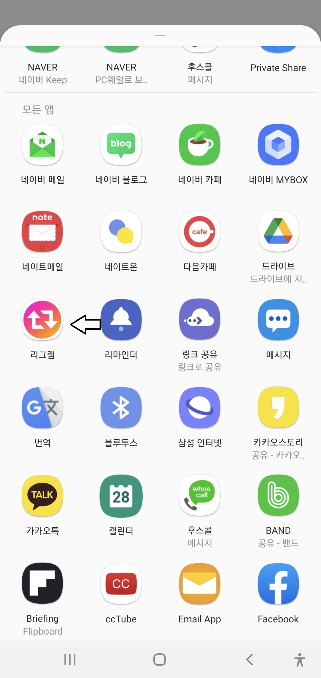 공유하기로 하시면 여러 어플들이 나오게 되는데 이곳에서 리그램을 선택해줍니다.