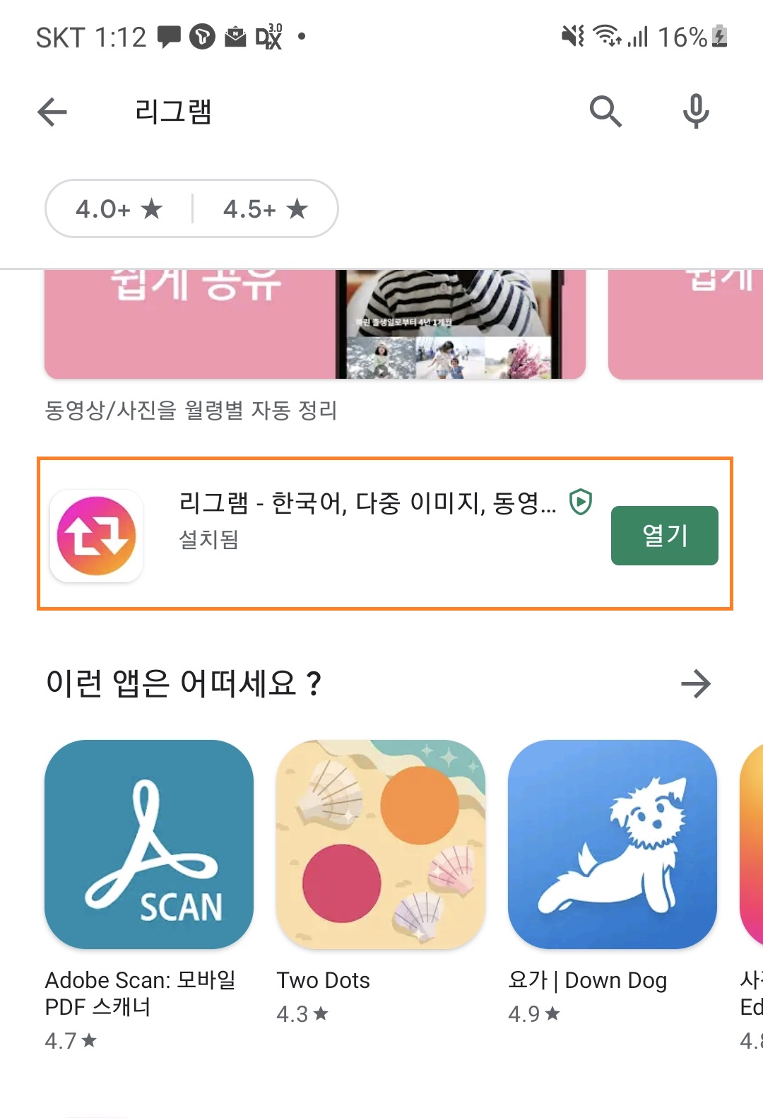 이번 포스팅은 안드로이드 기준임을 참고하시고 구글플레이에서 리그램을 검색해주시고 설치해주시면 됩니다.