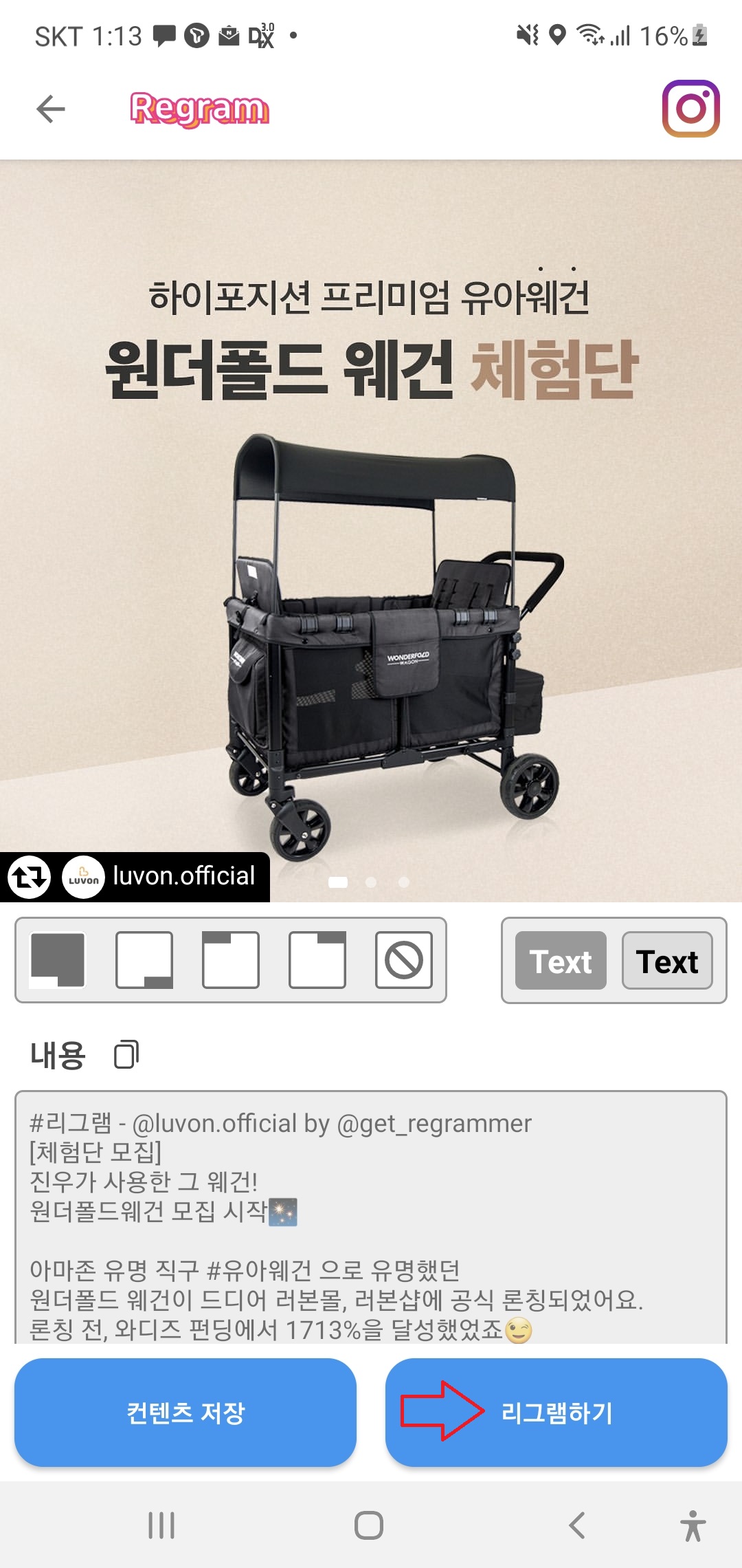 내용확인을 하시고 리그램하기로 넘어가주시면 사진들과 내용이 저장됩니다.