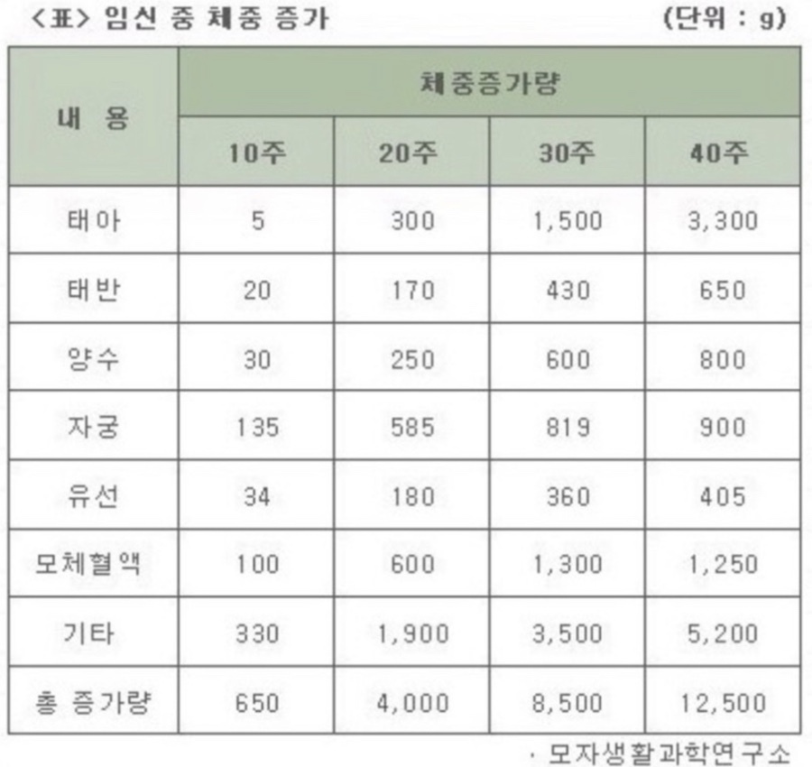 10주까지는 모든 무게를 합쳐도 1키로가 안되기때문에 10주까지는 체중증가한 몸무게는 모두 산모의 무게라고 보시면 됩니다.. ㅜㅜ 10주이후부터 한달에 1키로~1.5키로씩 느는것이 가장 이상적인 체중증가입니다.